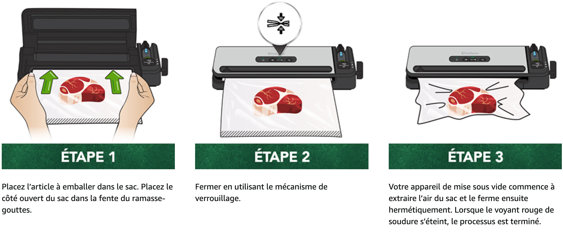 • Inclus 1 appareil de mise sous vide, 1 tuyau accessoire, 1 boîte, 1 rouleau de mise sous vide (28 cm נ3 m), 5 sachets petit format (0,94 L), 5 sachets grand format (3,78 L), 1 manuel d'instructions | Sans BPA